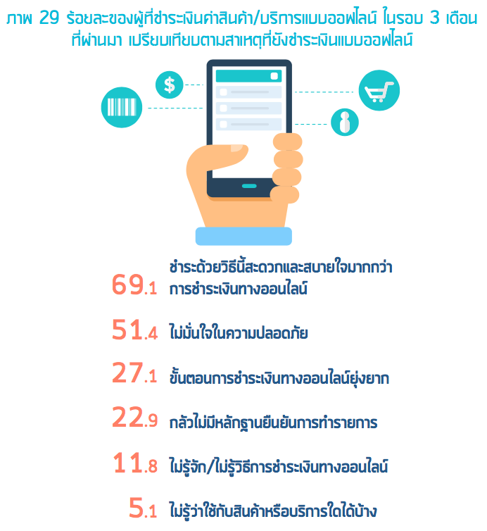 เมื่อมีการดูข้อมูลต่อว่าทำไมคนยังไม่ใช้การชำระเงินแบบออนไลน์ และไปใช้วิธีการชำระเงินแบบออฟไลน์ (ชำระเงินปลายทาง โอนเงินผ่านสาขาธนาคาร นัดเจอและชำระเงินสด ฯลฯ) ก็พบว่าคนรู้สึก “สะดวกใจและสบายใจมากกว่า” ตามมาด้วยความไม่มั่นใจในความปลอดภัย ซึ่งก็คงเป็นโจทย์ที่ต้องฝากไว้กับบรรดาผู้ให้บริการต่างๆ ว่าจะสามารถสร้างความเชื่อมั่นกับบริการชำระเงินออนไลน์ได้อย่างไร